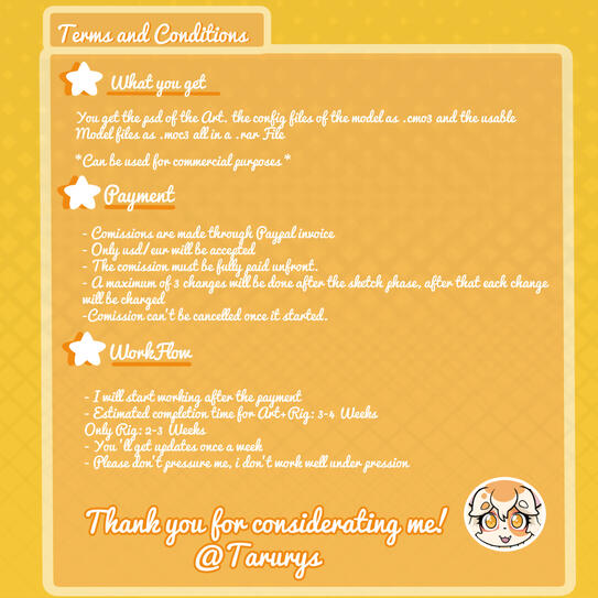 Hewo! (again) i'm a self taugh artist and a Live2D animator. i like to do kemonos but i'm really open to anything! i have about 3 years of experience and art and 2 in Live2D rigging. My models have a high range of expression so maybe give them a try! oh and i also like yellow and cats heheTerms and conditions: